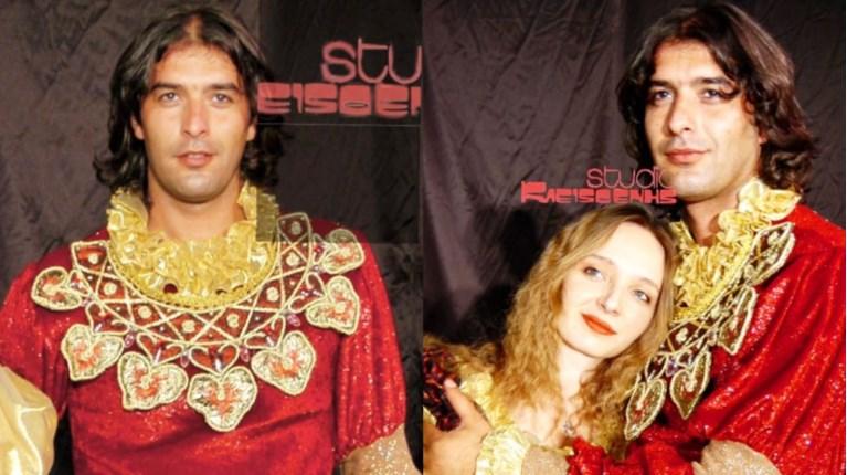 Ντυμένος πρίγκιπας, με μακρύ μαλλί και χωρίς γένια, ο Βασίλης Μπισμπίκης φαίνεται εντελώς αγνώριστος στην παιδική παράσταση “Η Πεντάμορφη και το Τέρας” η οποία ανέβηκε το 2005 στο “Θέατρο Γκλόρια”