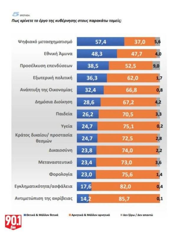 Το 67% κρίνει αρνητικά το συνολικό έργο της κυβέρνησης με τους τομείς που σημειώνουν τις μικρότερες επιδόσεις να είναι (και πάλι) η ακρίβεια, η αντιμετώπιση της εγκληματικότητας, το φορολογικό.