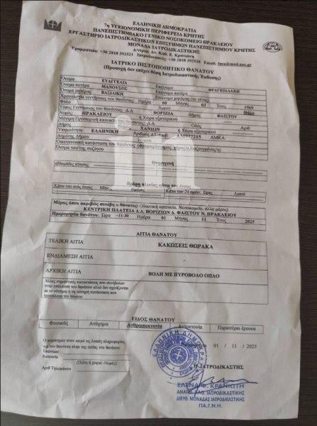 Σύμφωνα με το ιατρικό πιστοποιητικό θανάτου της 56χρονης γυναίκας που φέρνει στο φως το in, ο θάνατός της στα Βορίζια είναι από πυροβόλο όπλο, αν και αρχικά είχε αναφερθεί ότι έπαθε ανακοπή. Η 56χρονης εργαζόταν στο γενικό νοσοκομείο Χανίων και είχε πάει στο χωριό για να παρευρεθεί στο μνημόσυνο του ενός έτος του πατέρα της.