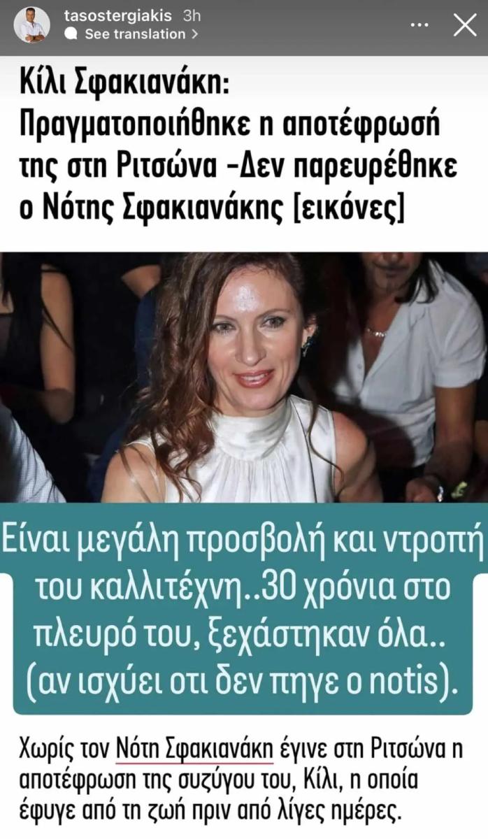 «Είναι μεγάλη προσβολή και ντροπή του καλλιτέχνη. 30 χρόνια στο πλευρό του ξεχάστηκαν όλα (αν ισχύει ότι δεν πήγε ο Νότης)», σημείωσε ο Τάσος Τεργιάκης στην ανάρτηση που έκανε στον προσωπικό του λογαριασμό στο Instagram.