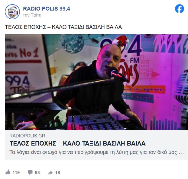 Η ανάρτηση του Ράδιο Πόλις με το οποίο συνεργαζόταν πολλά χρόνια αναφέρει: