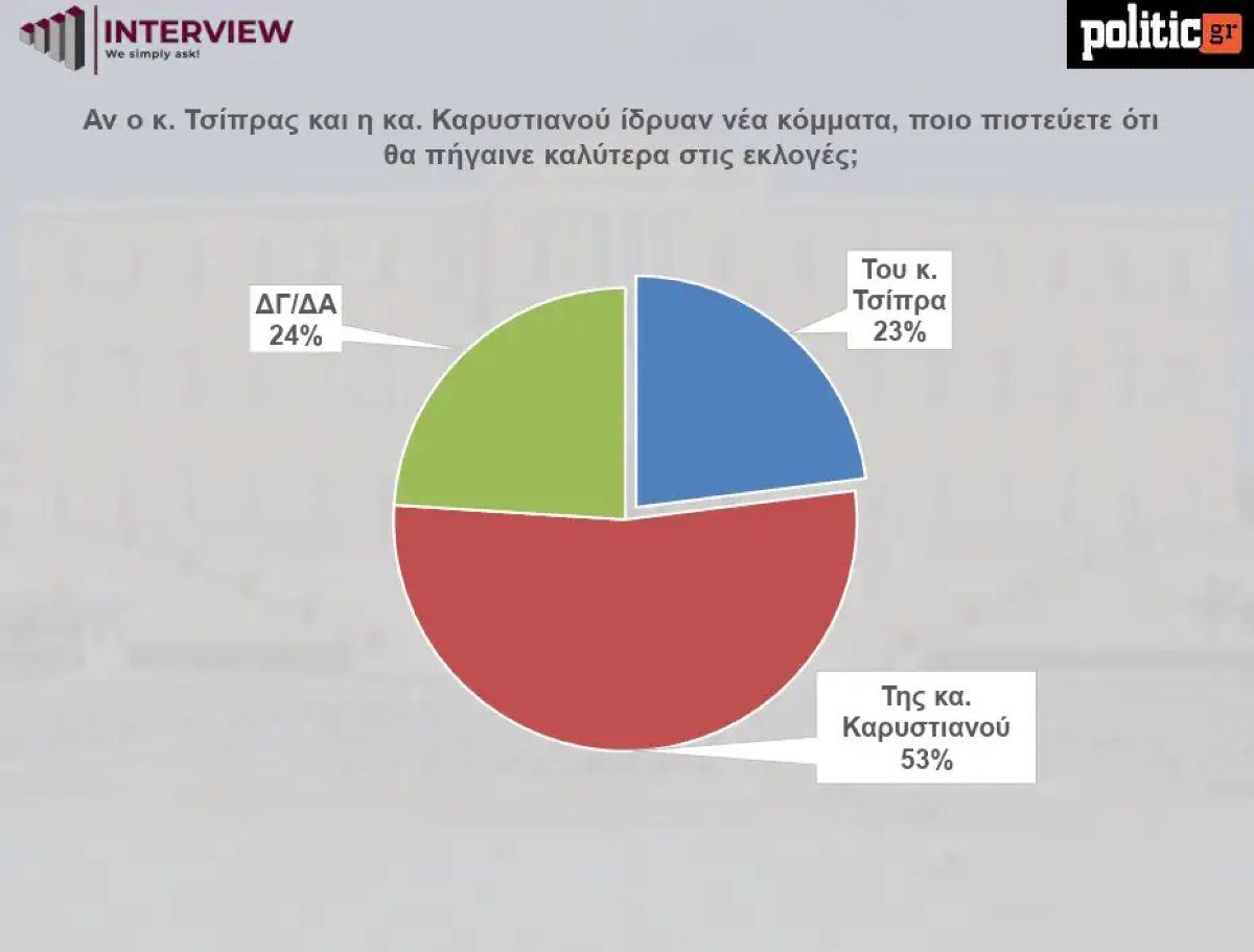 Τέλος, η έρευνα διερεύνησε και τις προτιμήσεις σε υποθετικό σενάριο δημιουργίας νέου κόμματος από γνωστά πολιτικά πρόσωπα. Το ενδεχόμενο κόμμα της Μαρίας Καρυστιανού συγκεντρώνει ποσοστό 53%, υπερδιπλάσιο σε σχέση με το 23% του αντίστοιχου κόμματος του Αλέξη Τσίπρα.