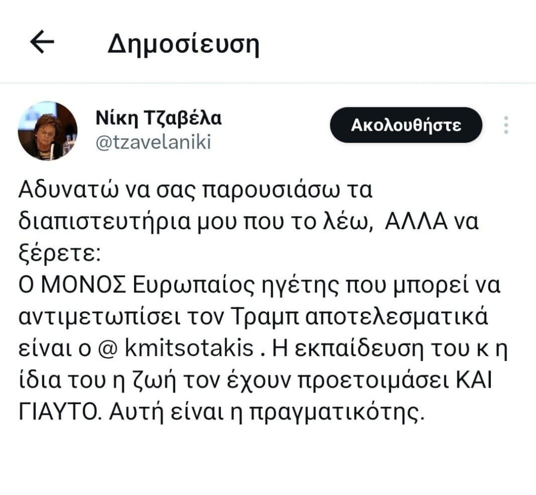 ος ηγέτης που μπορεί να αντιμετωπίσει τον Τραμπ αποτελεσματικά είναι ο Κυριάκος Μητσοτάκης. Η εκπαίδευση του και η ίδια του η ζωή τον έχουν προετοιμάσει ΚΑΙ ΓΙΑΥΤΟ. Αυτή είναι η πραγματικότης”.