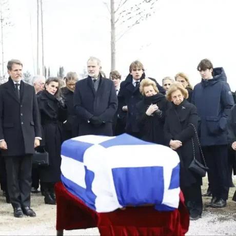 Η ισπανική βασιλική οικογένεια δημοσίευσε επίσημα φωτογραφίες από την ταφή, στις οποίες αποτυπώνεται η βασίλισσα Σοφία να αποχαιρετά σιωπηλά την αδελφή της και να κρατά την ελληνική σημαία που σκέπαζε το φέρετρο, εμφανώς συντετριμμένη, πλαισιωμένη από τα μέλη της οικογένειάς της.