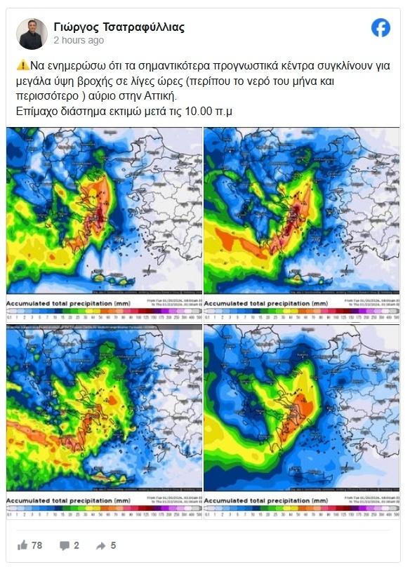 Η ανάρτηση του Γιώργου Τσατραφύλλια αναφέρει: «Να ενημερώσω ότι τα σημαντικότερα προγνωστικά κέντρα συγκλίνουν για μεγάλα ύψη βροχής σε λίγες ώρες (περίπου το νερό του μήνα και περισσότερο) αύριο στην Αττική. Επίμαχο διάστημα εκτιμώ μετά τις 10.00 π.μ.», αναφέρει ο μετεωρολόγος.