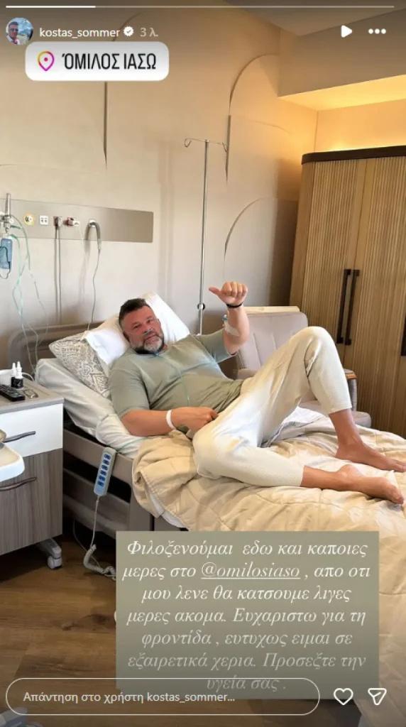 Συγκεκριμένα, μοιράστηκε δύο στιγμιότυπα στα οποία φαίνεται στο κρεβάτι του νοσοκομείου με τους ορούς στο πρόσωπο, με τον ίδιο να γράφει χαρακτηριστικά: «Φιλοξενούμαι εδώ και κάποιες μέρες στο @omilosiaso, από ό,τι μου λένε θα κάτσουμε λίγες μέρες ακόμα. Ευχαριστώ για την φροντίδα, ευτυχώς είμαι σε εξαιρετικά χέρια. Προσέξτε την υγεία σας».