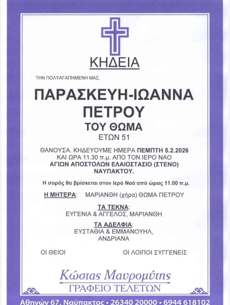 Η Ναύπακτος αποχαιρετά έναν αγαπημένο άνθρωπο που άφησε το δικό του φως στις ζωές όσων τη γνώρισαν. Αποχαιρετά μια μητέρα, μια φίλη, έναν άνθρωπο που αγαπήθηκε όσο λίγοι. Η κηδεία της θα τελεστεί την Πέμπτη στη Ναύπακτο.