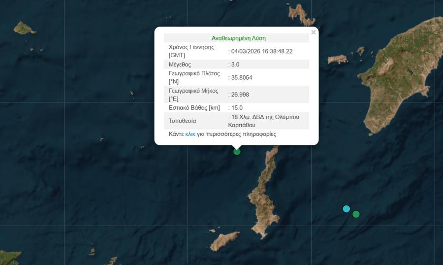Σεισμική δόνηση μεγέθους 3 βαθμών της κλίμακας Ρίχτερ σημειώθηκε το απόγευμα της Τετάρτης στην Κάρπαθος, προκαλώντας στιγμιαία ανησυχία στους κατοίκους του νησιού.