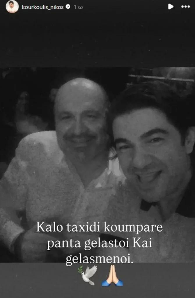 «Καλό ταξίδι, κουμπάρε. Πάντα γελαστοί και γελασμένοι», σημείωσε ο Νίκος Κουρκούλης στην ανάρτηση που έκανε για τον θάνατο του κουμπάρου του.
