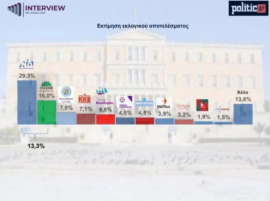 Δημοσκόπηση Interview: Ραγδαία πτώση για ΣΥΡΙΖΑ και άνετη δεύτερη θέση για ΠΑΣΟΚ – Πόσο παίρνουν τα κόμματα