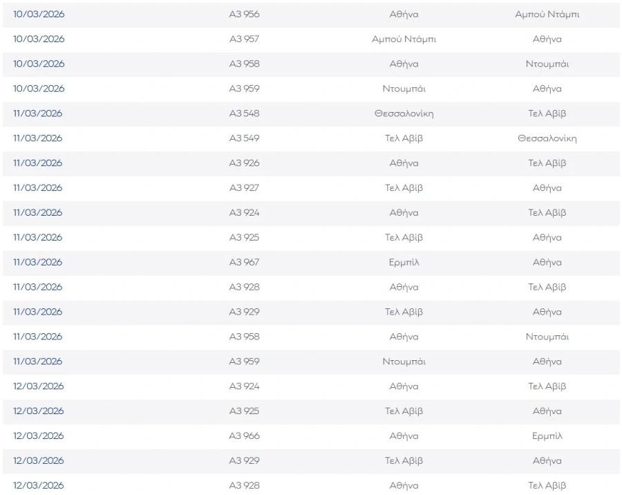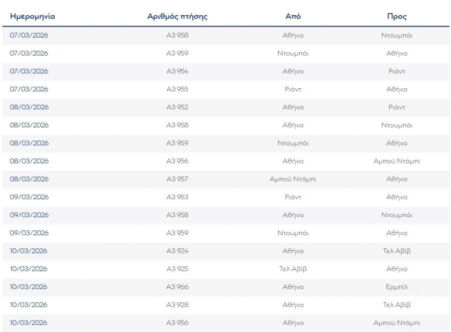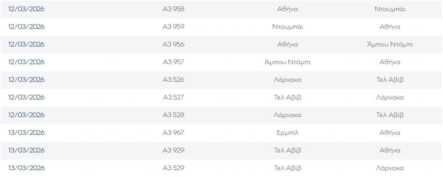 Επιπλέον, η AEGEAN ενημερώνει ότι, με στόχο τη διευκόλυνση των επιβατών που διαθέτουν εισιτήρια από και προς το Τελ Αβίβ, το Ερμπίλ, τη Βαγδάτη, τη Βηρυτό, το Αμπού Ντάμπι, το Ντουμπάι και επιπλέον το Ριάντ για πτήσεις με προγραμματισμένη αναχώρηση έως και τις 19 Μαρτίου 2026, παρέχει, εφόσον το επιθυμούν, τη δυνατότητα τροποποίησης των πτήσεων είτε με δωρεάν επανέκδοση και αλλαγή των εισιτηρίων, χωρίς επιπλέον κόστος, για νέα ταξίδια με ημερομηνία αναχώρησης έως και τις 30 Απριλίου 2026, είτε με ακύρωση της κράτησης και έκδοση credit voucher για μελλοντική χρήση.