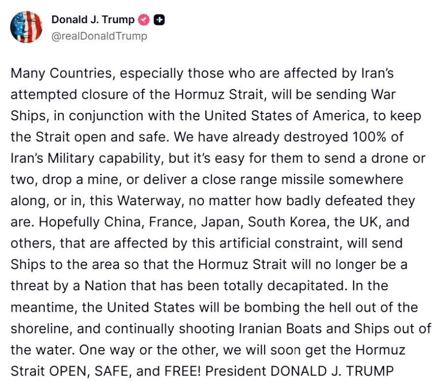 «Πολλές χώρες, ειδικά εκείνες που επηρεάζονται από την απόπειρα κλεισίματος των Στενών του Ορμούζ από το Ιράν, θα στείλουν πολεμικά πλοία, σε συνεργασία με τις Ηνωμένες Πολιτείες Αμερικής, για να διατηρήσουν τα Στενά ανοιχτά και ασφαλή. Έχουμε ήδη καταστρέψει το 100% της στρατιωτικής ικανότητας του Ιράν, αλλά είναι εύκολο για αυτούς να στείλουν ένα ή δύο drone, να ρίξουν μια νάρκη ή να εκτοξεύσουν έναν πύραυλο κοντινής εμβέλειας κάπου κατά μήκος ή μέσα σε αυτήν την πλωτή οδό, ανεξάρτητα από το πόσο άσχημα έχουν ηττηθεί. Ας ελπίσουμε ότι η Κίνα, η Γαλλία, η Ιαπωνία, η Νότια Κορέα, το Ηνωμένο Βασίλειο και άλλες χώρες, που επηρεάζονται από αυτόν τον τεχνητό περιορισμό, θα στείλουν πλοία στην περιοχή, ώστε τα Στενά του Ορμούζ να μην αποτελούν πλέον απειλή από ένα έθνος που έχει αποκεφαλιστεί εντελώς. Εν τω μεταξύ, οι Ηνωμένες Πολιτείες θα βομβαρδίζουν την ακτογραμμή και θα πυροβολούν συνεχώς ιρανικά σκάφη και πλοία έξω από το νερό. Με τον έναν ή τον άλλο τρόπο, σύντομα θα καταστήσουμε τα Στενά του Ορμούζ, ΑΝΟΙΧΤΑ, ΑΣΦΑΛΗ και ΕΛΕΥΘΕΡΑ! Πρόεδρος Ντόναλντ Τζ. Τραμπ».