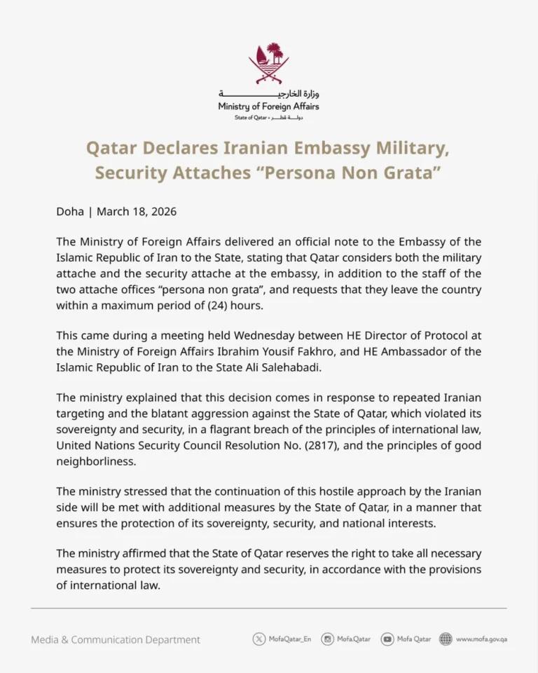 Το Υπουργείο Εξωτερικών του Κατάρ επέδωσε επίσημη ανακοίνωση στην Πρεσβεία της Ισλαμικής Δημοκρατίας του Ιράν που εδρεύει στο εμιράτο , δηλώνοντας ότι το Κατάρ θεωρεί τόσο τον στρατιωτικό ακόλουθο όσο και τον ακόλουθο ασφαλείας της πρεσβείας , καθώς και το προσωπικό των δύο γραφείων των ακολούθων, «persona non grata» και τους ζητά να εγκαταλείψουν τη χώρα εντός μέγιστης προθεσμίας εικοσιτεσσάρων ωρών.