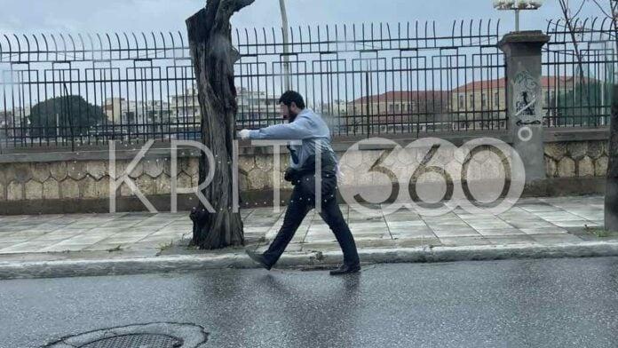Περαστικοί τον είδαν με σταθερό βήμα και αποφασιστικότητα να περπατά την οδό Παπανδρέου χωρίς να ενοχλείται από τις ψιχάλες της βροχής.