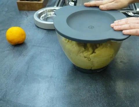 -Η ζύμη πρέπει να είναι αφράτη και εύπλαστη. Τη σκεπάζουμε και την αφήνουμε για 20 λεπτά να σταθεί.