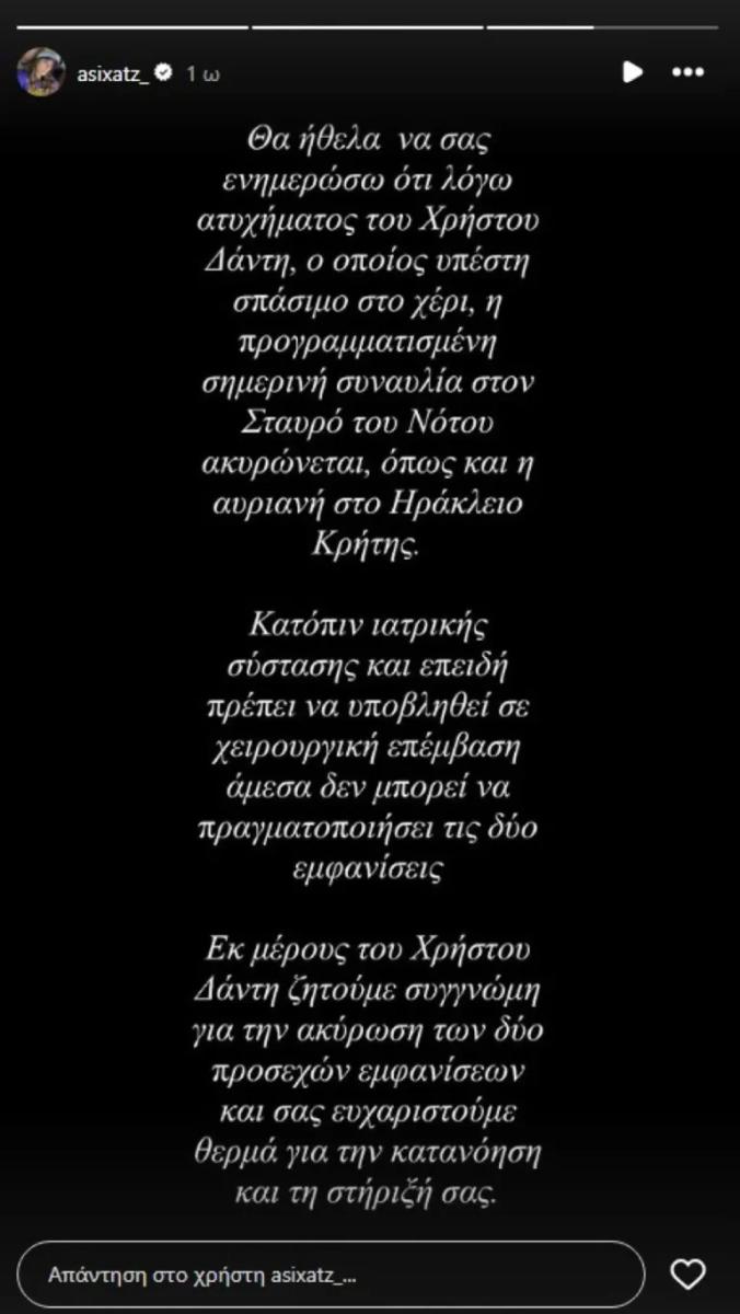 «Θα ήθελα να σας ενημερώσω ότι λόγω ατυχήματος του Χρήστου Δάντη, ο οποίος υπέστη σπάσιμο στο χέρι, η προγραμματισμένη σημερινή συναυλία στον Σταυρό του Νότου ακυρώνεται, όπως και η αυριανή στο Ηράκλειο Κρήτης. Κατόπιν ιατρικής σύστασης και επειδή πρέπει να υποβληθεί σε χειρουργική επέμβαση άμεσα δεν μπορεί να πραγματοποιήσει τις δύο εμφανίσεις» ανέφερε η Ασημίνα Χατζηανδρέου σε story της.