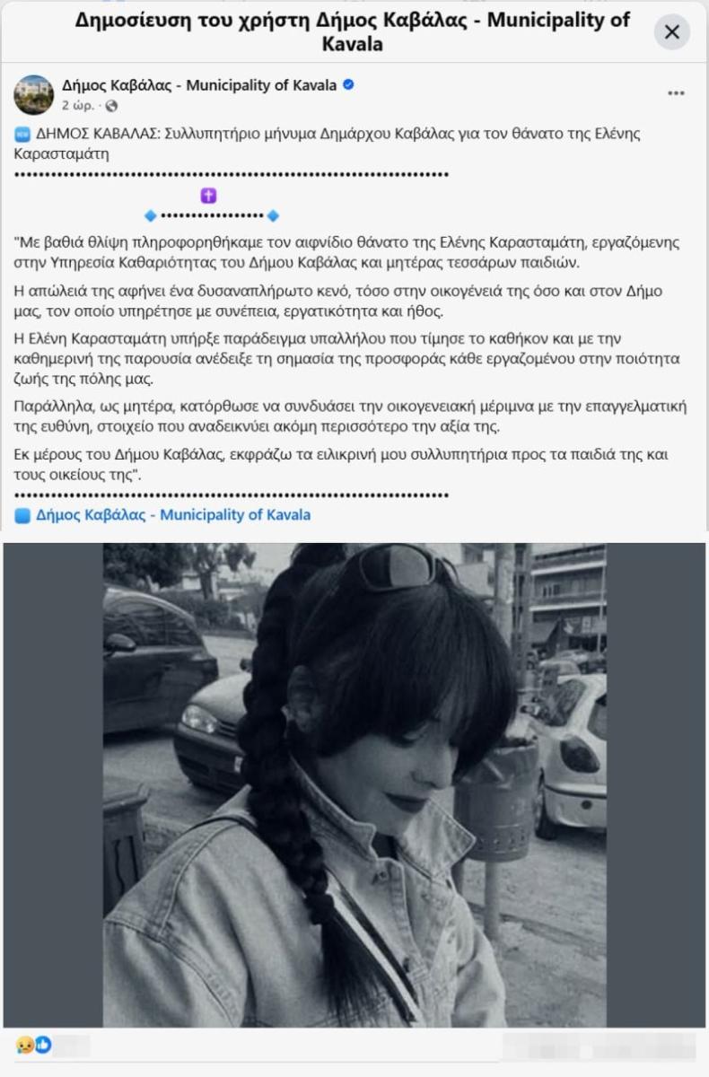 «Με βαθιά θλίψη πληροφορηθήκαμε τον αιφνίδιο θάνατο της Ελένης Καρασταμάτη, εργαζόμενης στην Υπηρεσία Καθαριότητας του Δήμου Καβάλας και μητέρας τεσσάρων παιδιών. Η απώλειά της αφήνει ένα δυσαναπλήρωτο κενό, τόσο στην οικογένειά της όσο και στον Δήμο μας, τον οποίο υπηρέτησε με συνέπεια, εργατικότητα και ήθος», αναφέρει ο δήμαρχος Καβάλας.